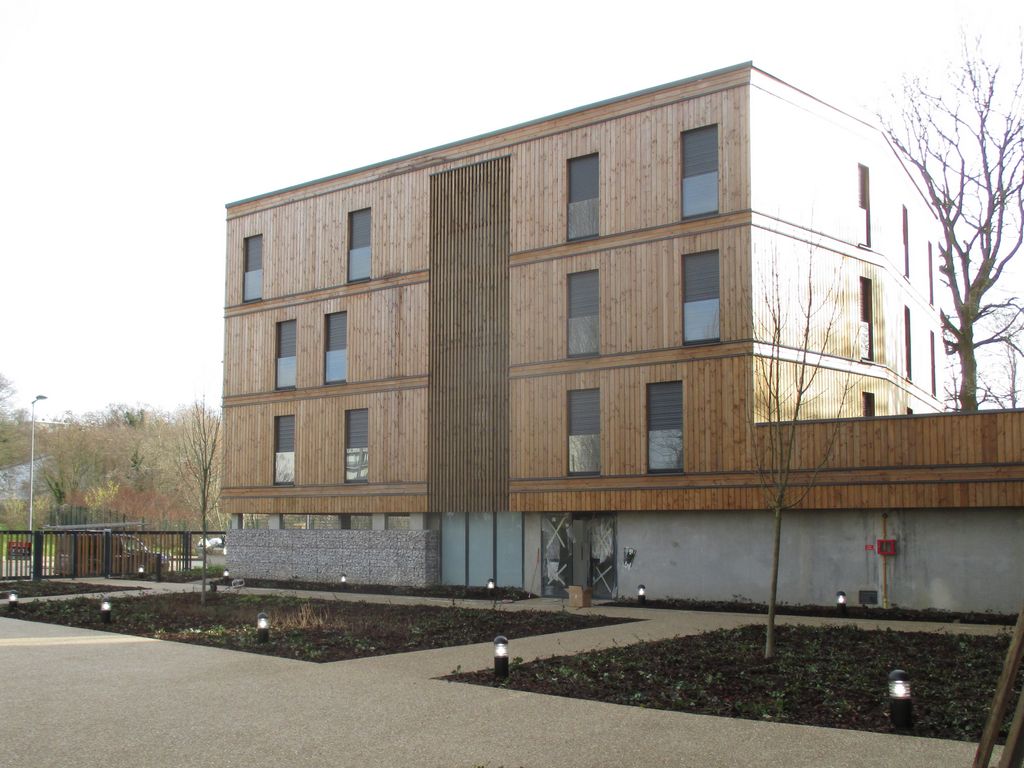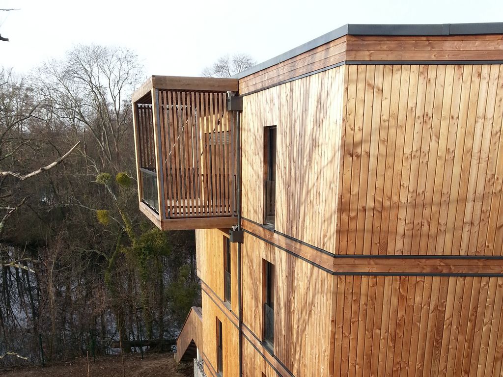 Construction d'un bâtiment de 18 logements collectifs réalisé à Draveil (91), avec murs en ossature bois et balcons vêtus de bardage bois.